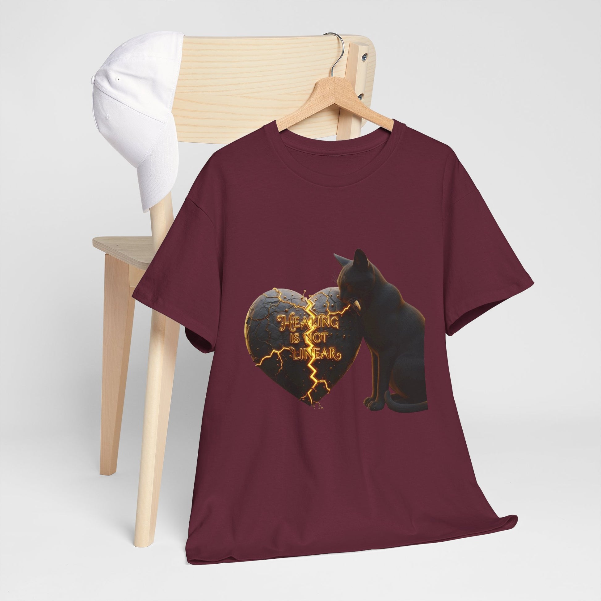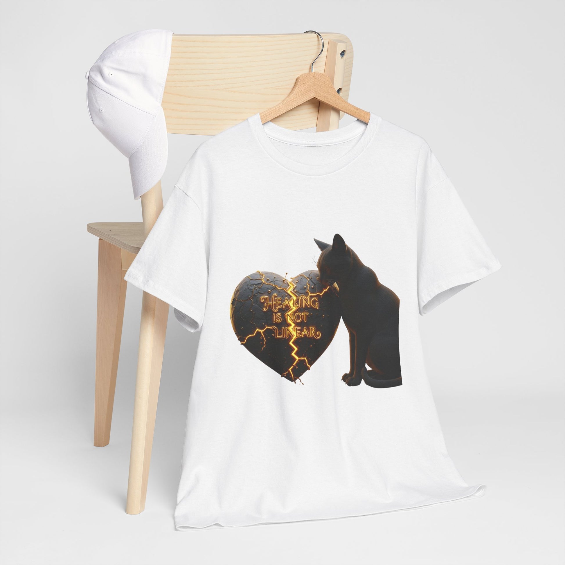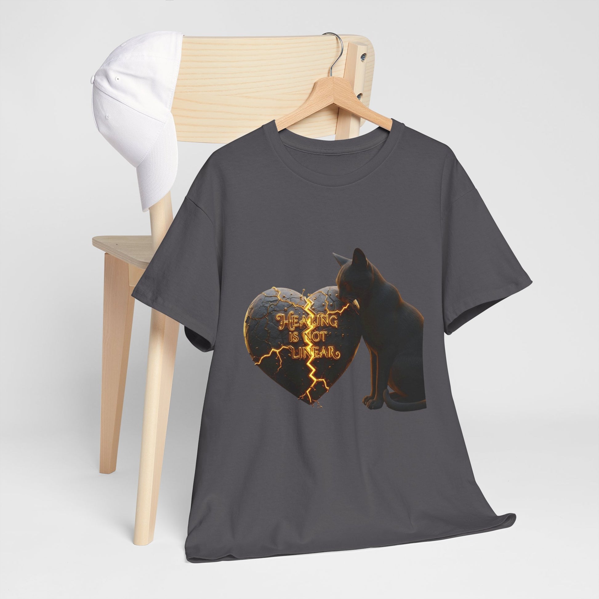 Growth is messy, and that's okay. This cinematic design features a cat with a cracked stone heart glowing with golden magma. A powerful reminder that recovery and personal growth have ups, downs, and necessary breaks.